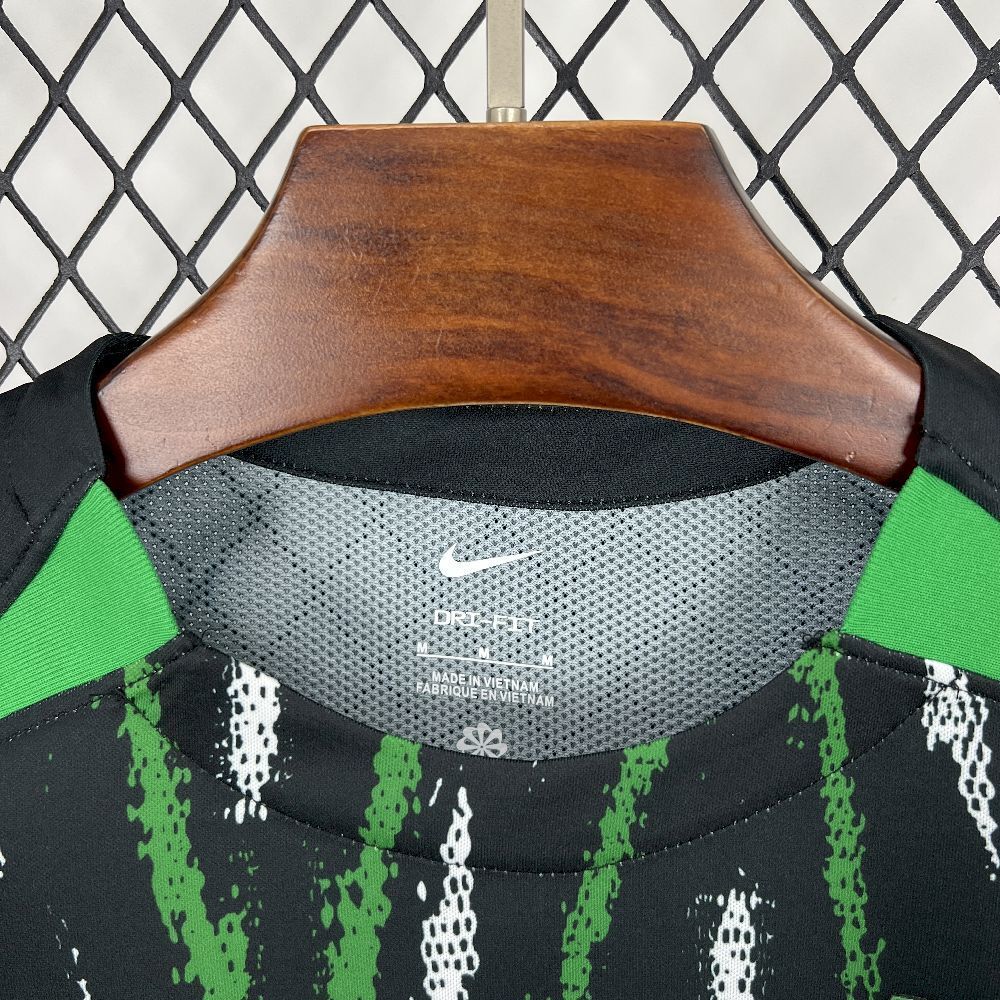 Negro con un patrón dinámico de pinceladas verdes y blancas: una apuesta disruptiva y enérgica que rompe con lo convencional. Un diseño vanguardista que destaca por su agresividad visual y modernidad. 👉 Disponible en: www.classicfootballshirtsshop.com