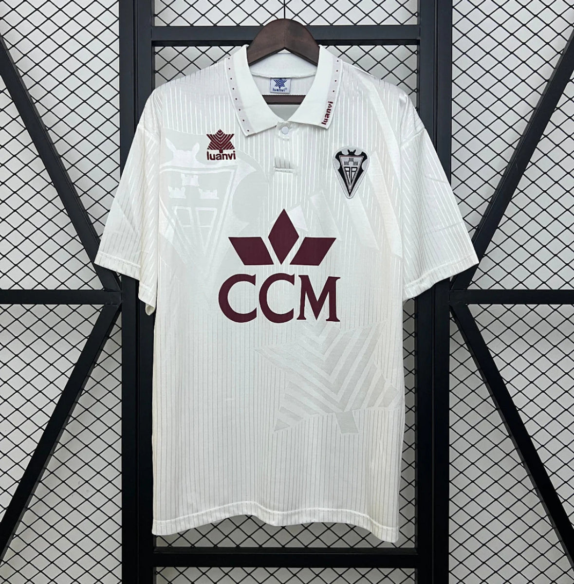Blanco impoluto con detalles en granate y marca de agua: una equipación que representa la esencia del Albacete Balompié en Primera División durante mediados de los 90. Destaca por su elegancia clásica y los gráficos integrados en el tejido que definieron una época. 👉 Disponible en: www.classicfootballshirtsshop.com